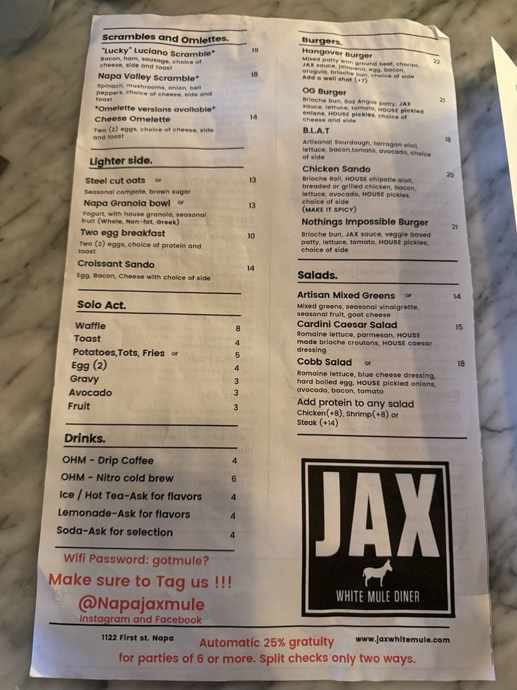 Welcome to Jax Diner, a vibrant American spot in Napa, CA, specializing in breakfast and brunch. This women-owned establishment offers a delightful menu that caters to diverse tastes, featuring everything from mouthwatering avocado toast and crab cake Benedict to indulgent chicken and waffles. Each dish is crafted to perfection, as evidenced by rave reviews from patrons who sing praises for the flavorful fried chicken and remarkable grits. Vegan options are available, ensuring that everyone can find something to love.